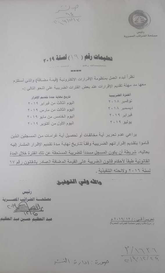 تعليمات رئيس مصلحة الضرائب المصرية لاقرار القيمة المضافة رقم 19 لسنة 2019