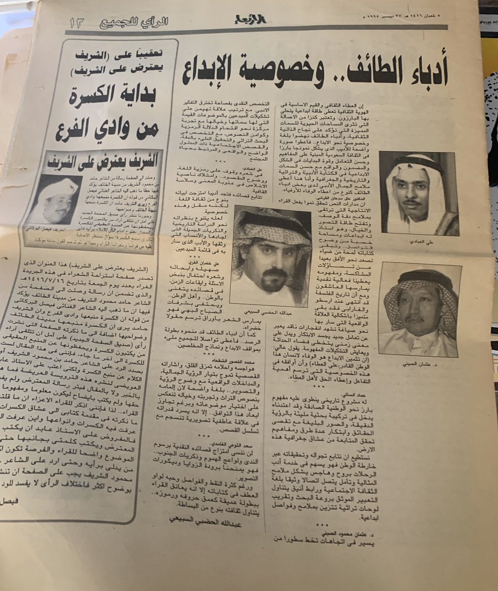 عبدالله بن سعد الح ض ب ي على تويتر أدباء الطائف وخصوصية الابداع جريدة المدينة 5 8 1416 ملحق الأربعاء ص 13