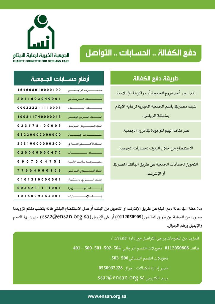 أرقام حسابات الجمعية الجمعية الخيرية لرعاية الايتام إنـسان