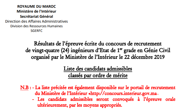 وزارة الداخلية لائحة المدعوين لإجراء الاختبار الشفوي لمباراة توظيف 24 مهندس دولة من الدرجة الأولى