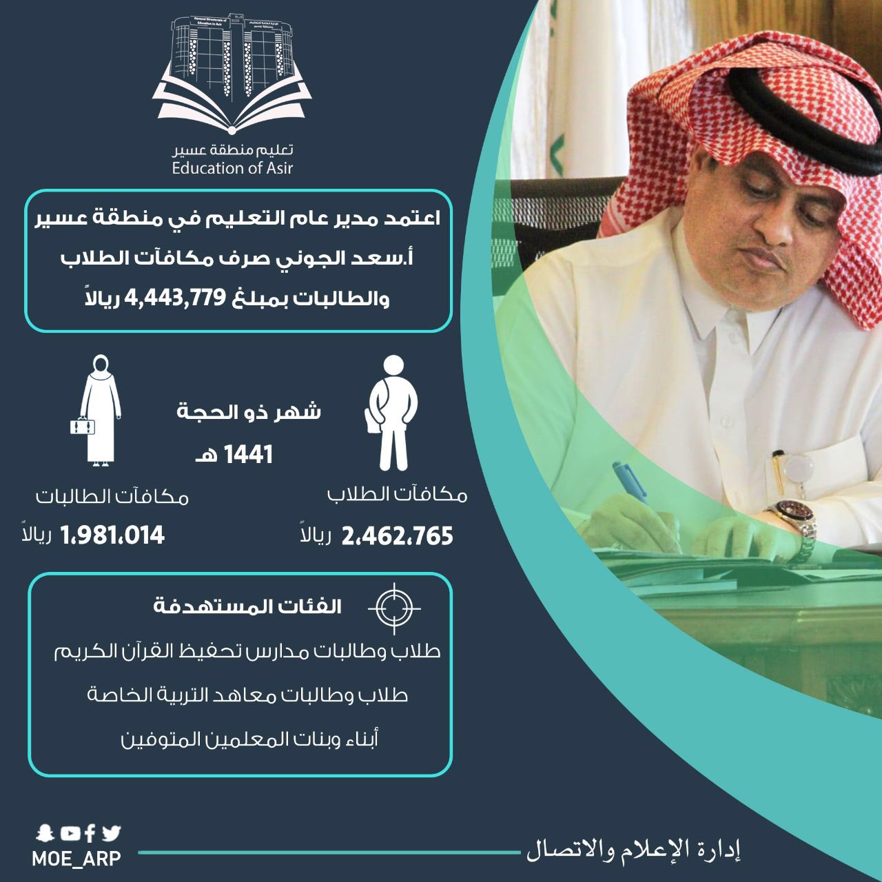 عسير نيوز الإلكترونية اعتمد مدير عام تعليم عسير سعد الجوني صرف 4 4 ملايين ريال تمثل مكافآت الطلاب والطالبات لشهر ذي الحجة لعام 1441