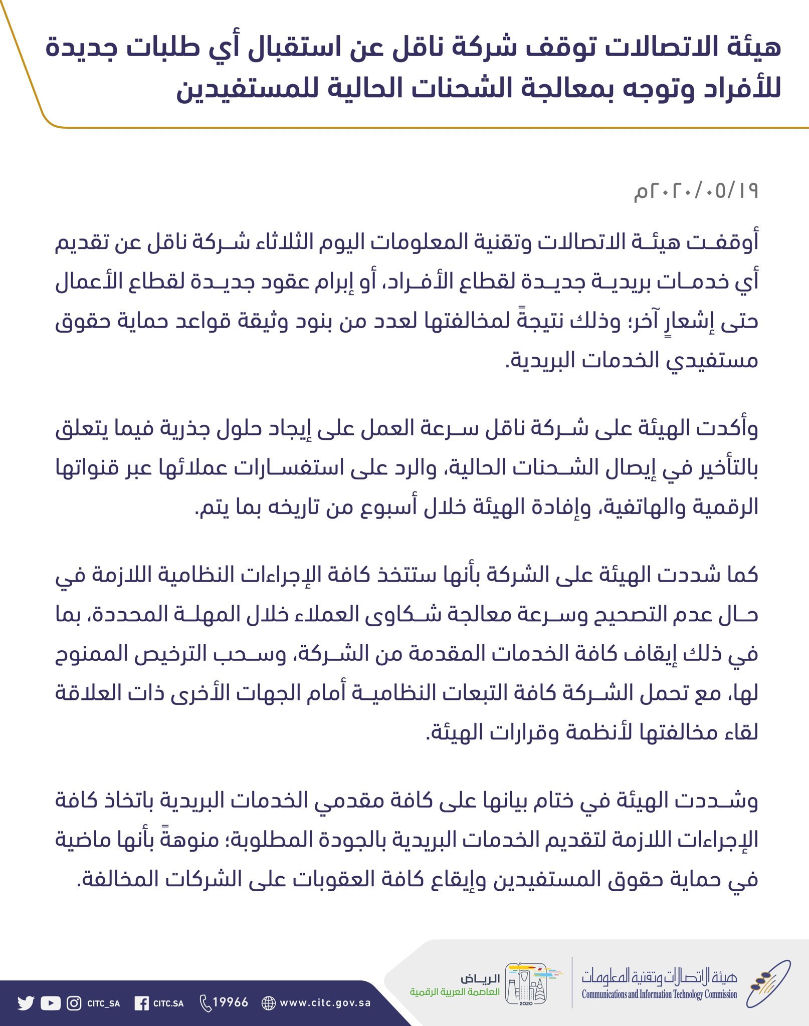عبدالله البرقاوي On Twitter هيئة الاتصالات توقف شركة ناقل عن استقبال أي طلبات جديدة للأفراد وتوجه بمعالجة الشحنات الحالية للمستفيدين