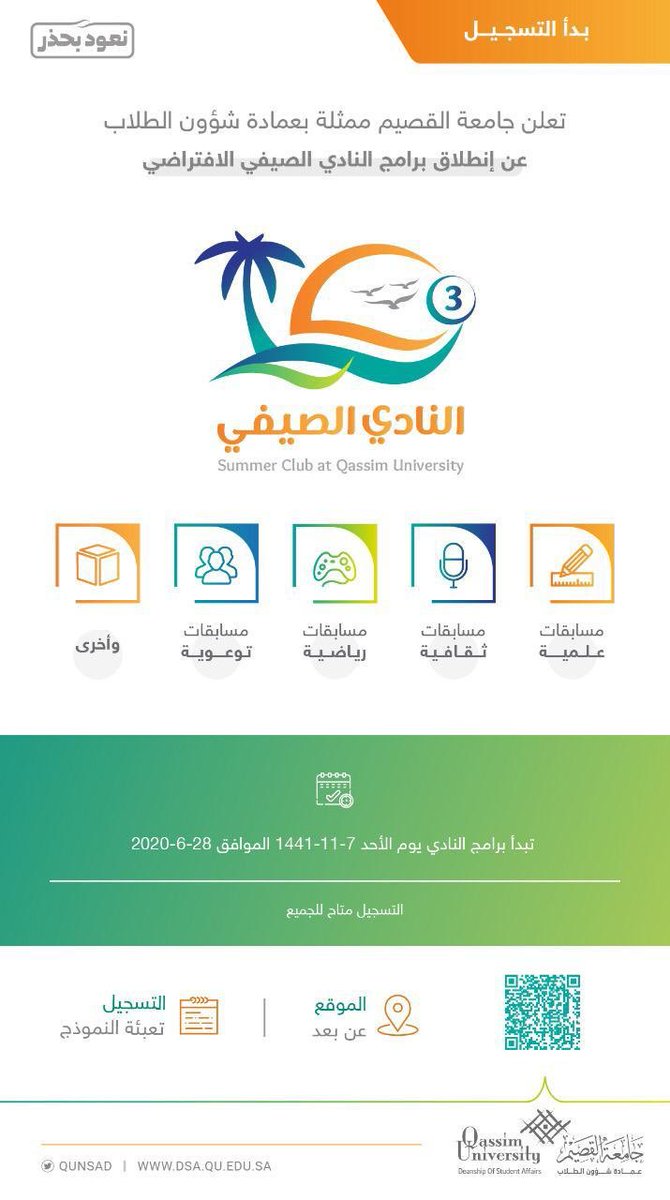 جامعة القصيم على تويتر تعلن جامعة القصيم ممثلة بعمادة شؤون الطلاب عن بدء التسجيل في النادي الصيفي الثالث Qu والذي سينطلق يوم الأحد 1441 11 7هـ عن بعد ويشمل برامج ومسابقات متنوعة نموذج التسجيل Https T Co Mnssuo3ihk Https T Co Cdo3ctlolo