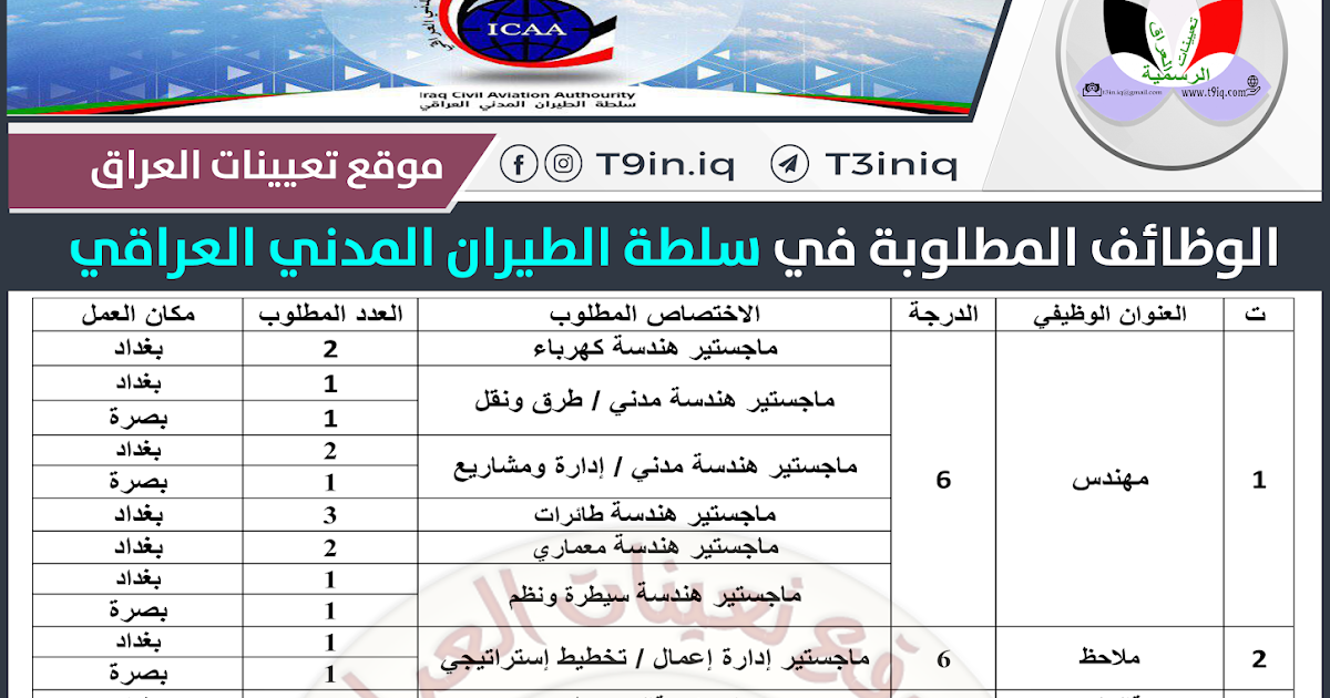 تعلن سلطة الطيران المدني العراقي عن توفر الدرجات الوظيفية الشاغرة في بغداد و البصرة